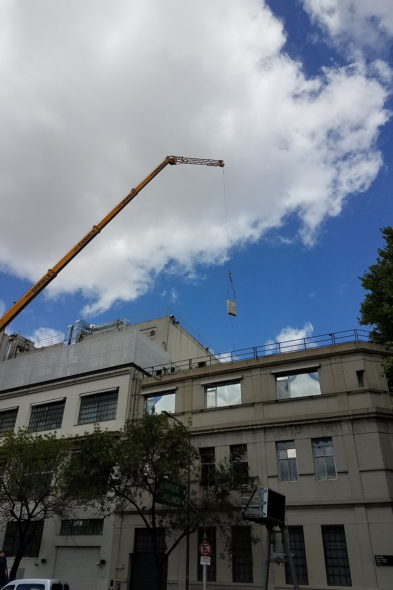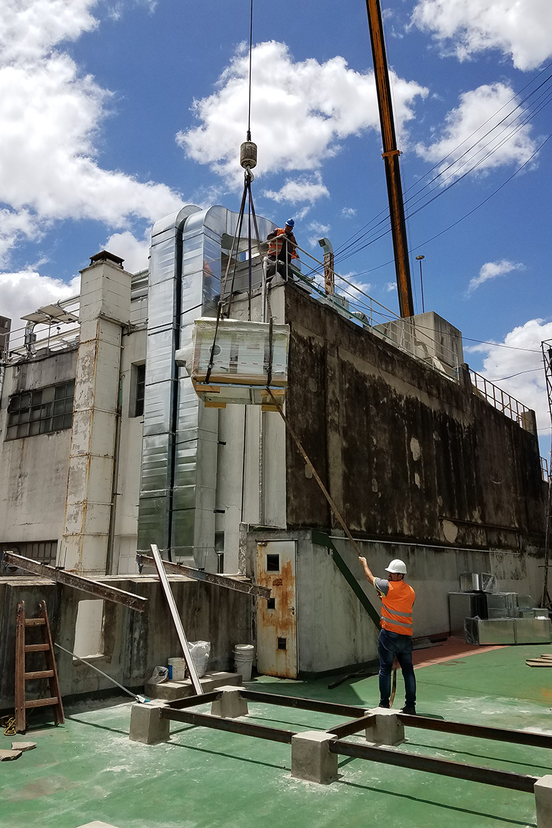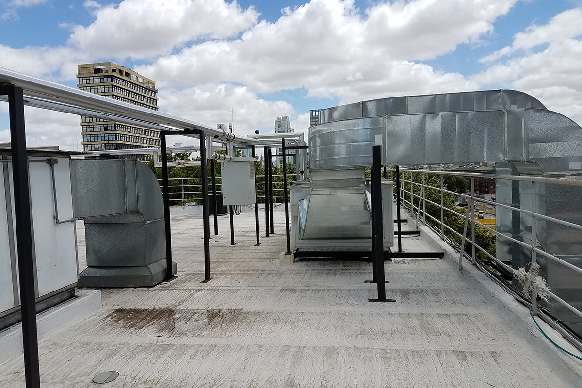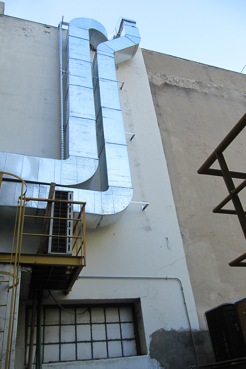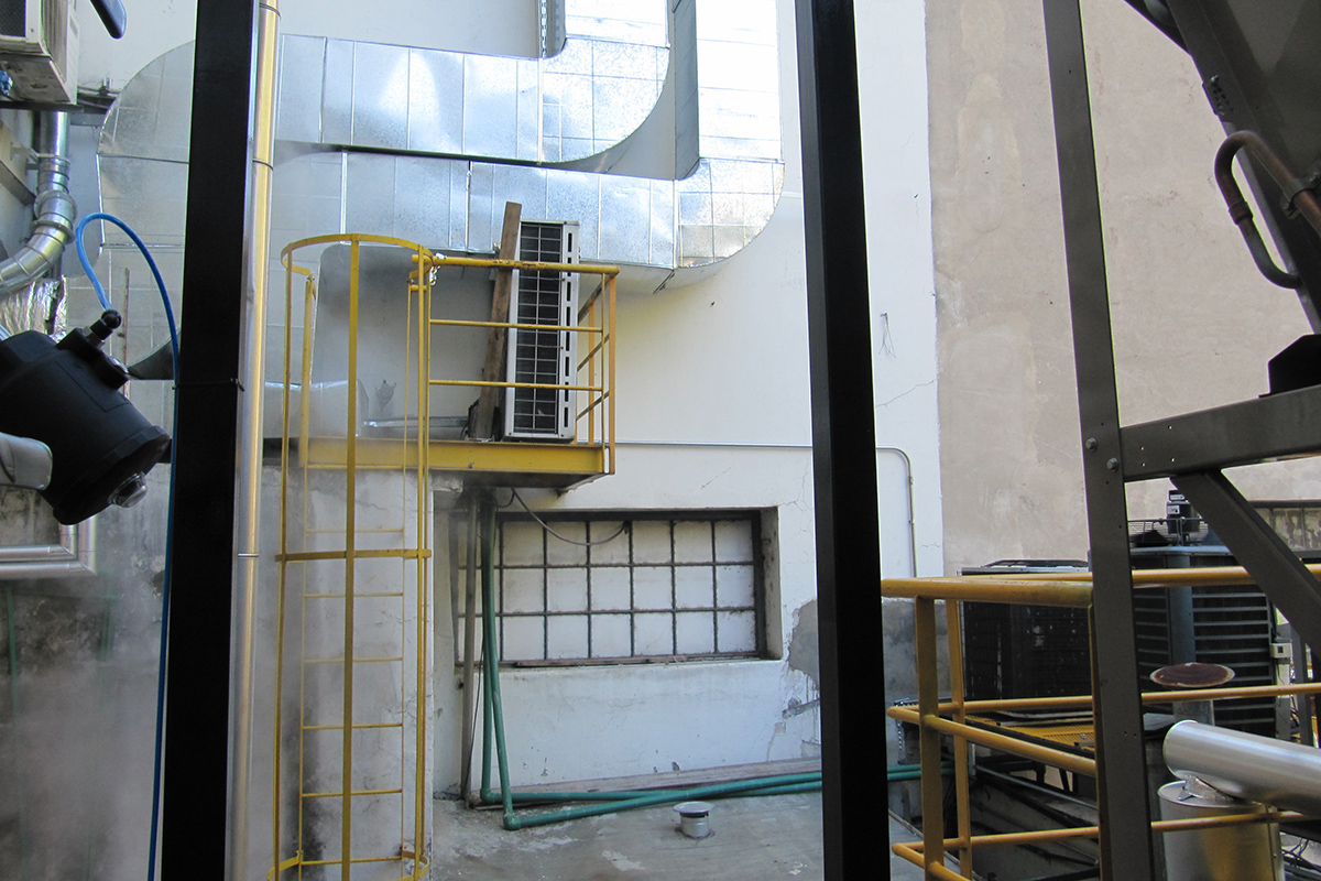 Los condicionamientos desafiantes del proyecto, se concentraban en los espacios físicos reducidos tanto para las instalaciones dentro como fuera del sector. El recorrido de los conductos a lo largo de una medianera lateral, tuvo que ser efectuada a través de una estructura tubular paralela, que garantizara sobre todo la seguridad de las personas durante su instalación. Dentro del local, la altura y la limitación del espacio requirieron de un diseño particular de la distribución de los elementos terminales para cubrir tanto los requerimientos normativos como la condición de confort de los ocupantes durante la operación del reactor.