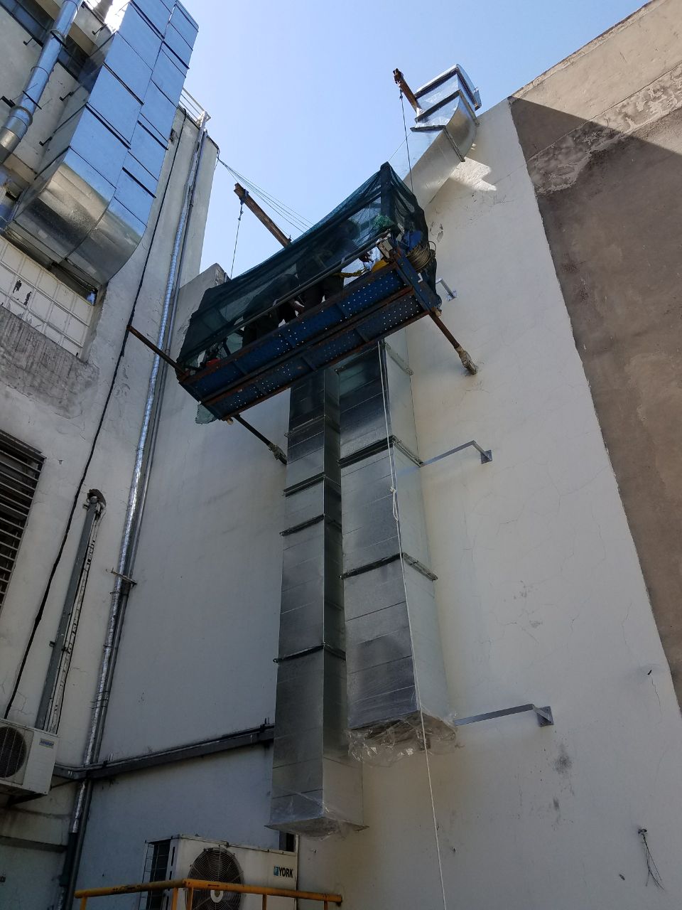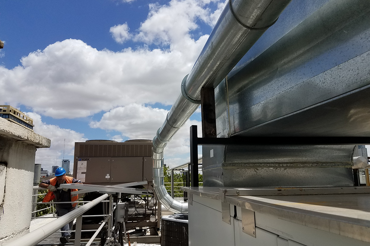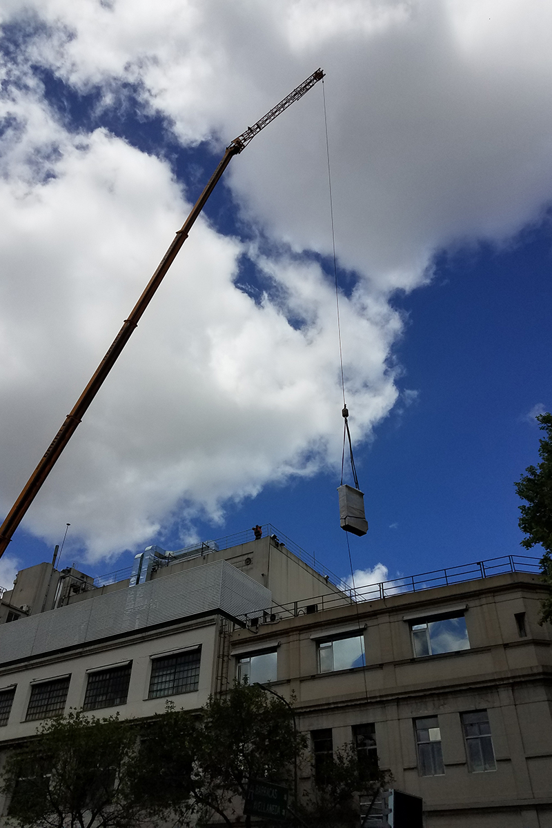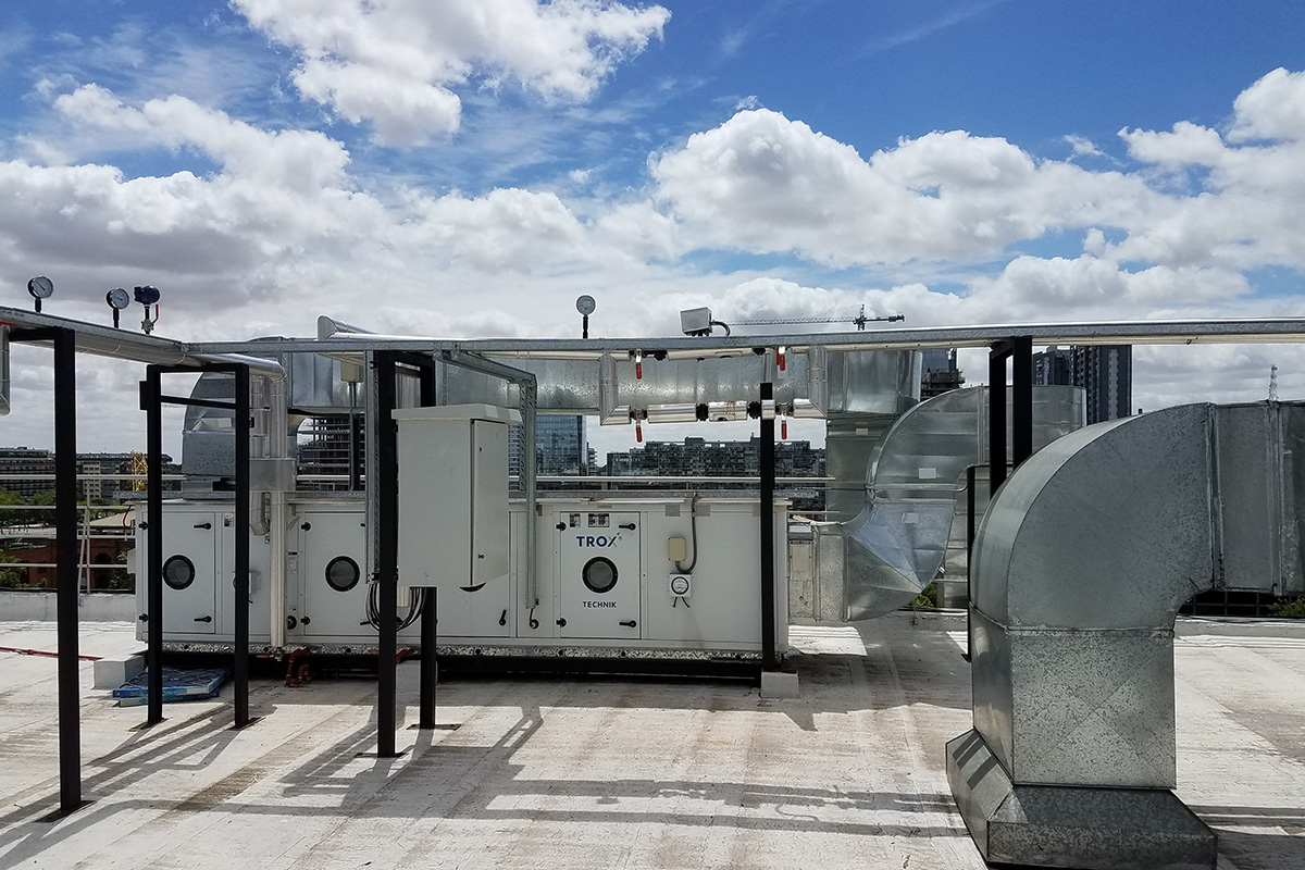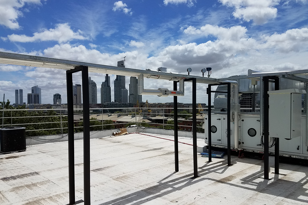 Los condicionamientos desafiantes del proyecto, se concentraban en los espacios físicos reducidos tanto para las instalaciones dentro como fuera del sector. El recorrido de los conductos a lo largo de una medianera lateral, tuvo que ser efectuada a través de una estructura tubular paralela, que garantizara sobre todo la seguridad de las personas durante su instalación. Dentro del local, la altura y la limitación del espacio requirieron de un diseño particular de la distribución de los elementos terminales para cubrir tanto los requerimientos normativos como la condición de confort de los ocupantes durante la operación del reactor.